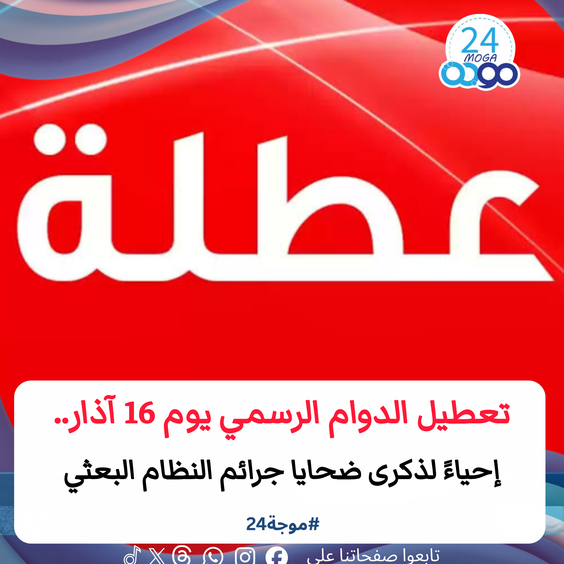 أعلنت الأمانة العامة لمجلس الوزراء تعطيل الدوام الرسمي يوم الاثنين الموافق 16 آذار 2026، في جميع الوزارات والجهات غير المرتبطة بوزارة والمحافظات كافة، وذلك إحياءً لذكرى الجرائم التي ارتكبها النظام البعثي الصدامي بحق الشعب العراقي، والتي تشمل مجازر حلبجة والأنفال والمقابر الجماعية وانتفاضة الشعبانية واغتيال العلماء واستهداف الأحزاب، استناداً إلى أحكام قانون العطلات الرسمية رقم 12 لسنة 2024.